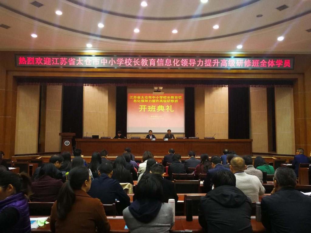 2017年10月29日至11月4日,江苏省太仓市中小学校长教育信息化领导力提升高级研修班在华中师范大学成功举办。10月30日上午,本次研修班开班仪式在华中师范大学科学会堂一楼报告厅举行,华中师范大学国家数字化学习工程技术研究中心副主任吴邵靖、副部长马兰、中共太仓市教育工委书记、市教育局局长何永林、中共太仓市教育工委副书记张跃忠等出席了开班仪式。