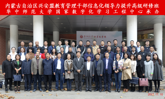 2017年11月9日至11月15日,内蒙古自治区兴安盟教育管理干部信息化领导力提升高级研修班在华中师范大学成功举办。11月10日上午,本次研修班开班仪式在华中师范大学科学会堂201室举行,华中师范大学国家数字化学习工程技术研究中心副主任吴绍靖、兴安盟教育局师资管理科科长李秀玲、兴安盟教育局信息技术科科长张立平等出席了开班仪式。